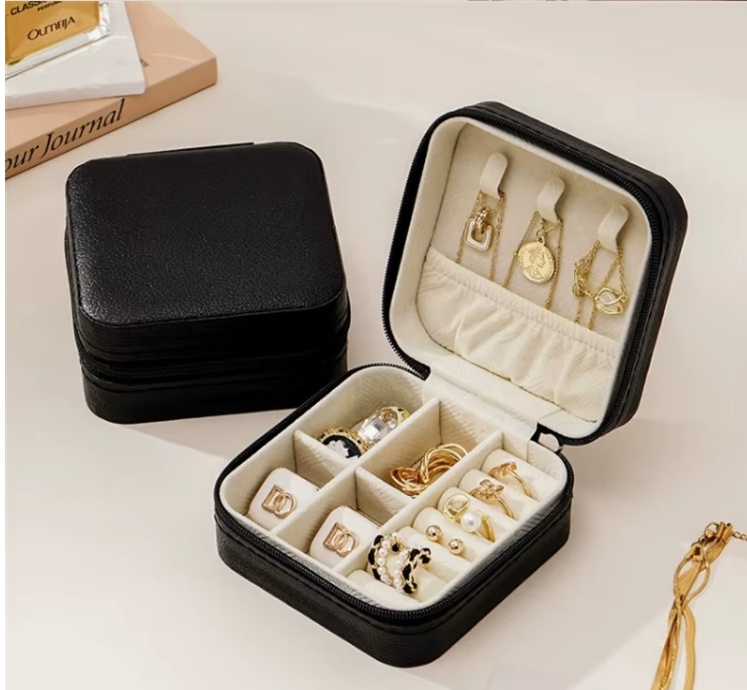 Travel Portable Jewelry Organizer Box - High Quality PU Leather - Velvet Ring Jewelry Necklace Boxes. Perfect size for travel. Dimensions: 3X3X3 cm.